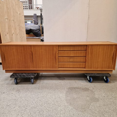 Høj skænk i teak med skydelåger og skuffer. Møblet står på slanke ben og har flere sektioner med både åbne og lukkede opbevaringsrum. Indvendigt er der hylder, skuffer og et bar med spejl og glasplade. Højde: 128,5 cm Længde: 200 cm Dybde: 42,5 cm