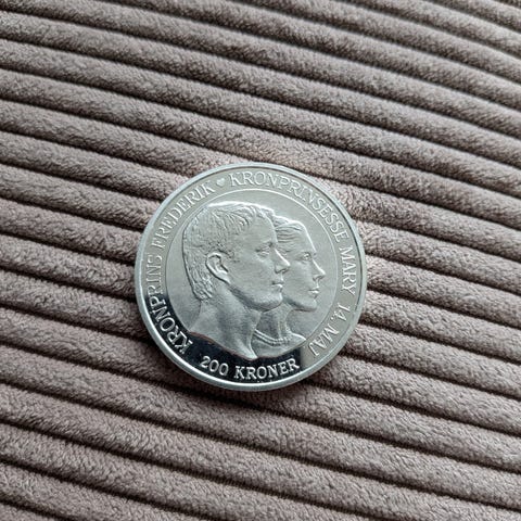 Den Kgl. Mønt 200-krone mindemønt i sølv. Udsendt til erindring om prins Joachim og Alexandras bryllup den 18. november 1995. Mønten er udført af medaljør Jan Petersen, Den Kgl. Mønt.