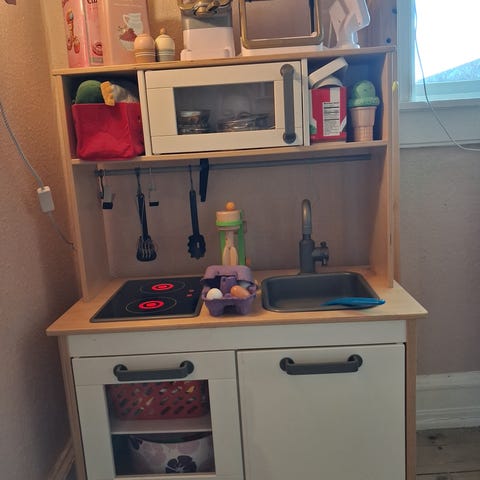 IKEA DUKTIG legekøkken. Stilfuldt renoveret med lækre detaljer. Unikt IKEA-hack. Malet med slidstærk Dyrup maling i superflot babylyserød farve kombineret med en sart lysegrøn. Der er sat helt ny, ekstra stor bordplade på med fin speciel vandhane og elegante lyserøde porcelænsgreb på lågerne samt unikke "betjeningsknapper" på panelet. Der er elektrisk lyskæde henover bordpladen. Fine nyindkøbte kager, brød og frugter til at lege med og et helt nyt uåbnet bedårende lyserødt Spire madlavningssæt med batteridrevne køkkenmaskiner. Der medfølger også lidt gryder og div. service og et lille dekorationsskilt. Alt man ser på billederne følger med. Der er lys i "ovnen" og kogepladen virker.