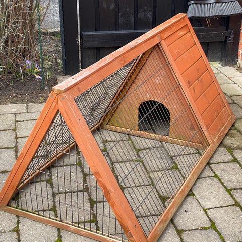 Trampolinstel, som er vendt på hovedet (4,2 meter i diameter). Net sat på og har været brugt til kaninløbegård