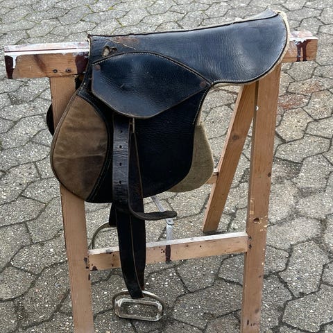 Med stigbøjler. Skal måske bruges som dekoration, som barstol, temafest, cowboyfest, westernfest, eller andet sjovt….