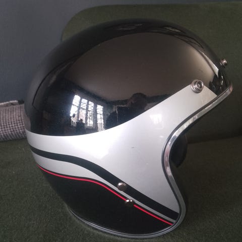Flot knald rød hjelm med vesir, hjelmen er stort set ikke brugt og fremstår som ny
