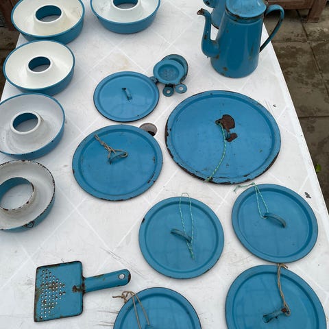 Madam blå, vintage Blå emalje køkkenredskaber og bageforme sæt
