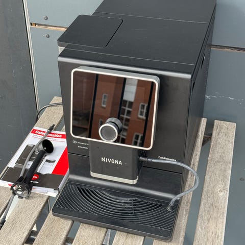 Nivona fuldautomatisk espressomaskine i mat sort med mælkeskummer. Købt april 2024 i Rigtig Kaffe i Århus. Kvittering haves. Vedligeholdt med regelmæssig afkalkning og rens.