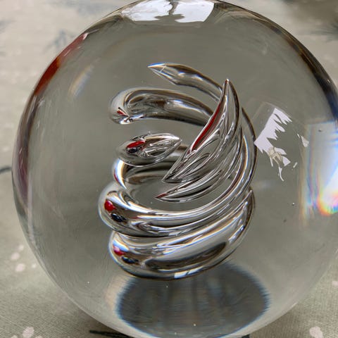 Glas, Brevpresse / brevvægt, Royal Copenhagen, Brevpresse / brevvægt med stjernetegn Tvilling fra Royal Copenhagen, den store model. I hel og fin stand. Har en diameter på 9 cm. og er 5 cm. høj. Designet af Torben Jørgensen.