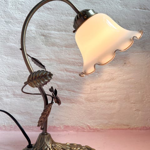 Lampens glas har et smukt spil i lyset og fungerer både som funktionel belysning og dekorativt element. Messingstangen og fatningen giver et elegant, klassisk udtryk. Ledningen fremstår udskiftet/retrofittet for bedre sikkerhed.