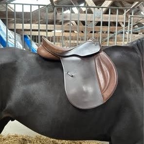 Ridesadel i brun læder. Sadel med dybt sæde og knæstøtter, egnet til almindelig ridning. Klassisk udformning med lange sadelklapper. Velegnet til brug på hest, hvor der ønskes en traditionel lædersadel.