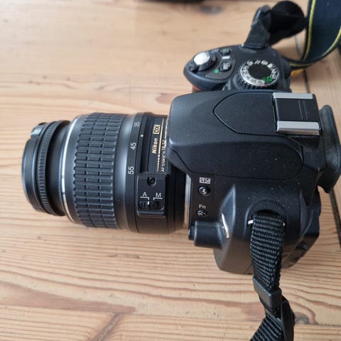 Nikon D60 spejlreflekskamera med Nikon AF-S DX Zoom-Nikkor 18-55mm f/3.5-5.6G ED II objektiv. Kameraet er et digitalt spejlreflekskamera egnet til generel fotografering, f.eks. portrætter, rejser og hverdagsbilleder. Zoomobjektivet dækker brændviddeområdet 18-55mm, hvilket giver mulighed for både vidvinkel- og kort telefotooptagelser. Sættet på billederne inkluderer kamerahus, objektiv, kamerarem, oplader (Nikon Quick Charger MH-23) samt kabler. Farven på kamerahuset og objektivet fremstår som sort.