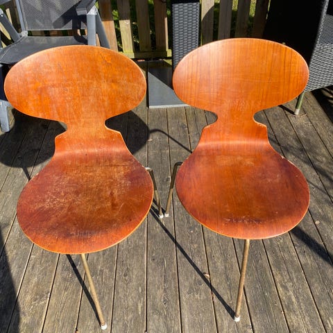 3 af stolene er med lys finer, mens den fjerde har lidt mørkere finer. Sidstnævnte har også trykmærker på sædet fra stabling. Mærkerne plejer at forsvinde, når stolen har stået frit lidt tid.