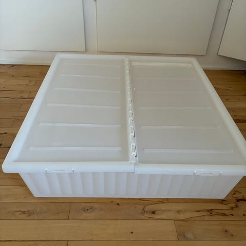 IKEA opbevaringsboks. Velegnet til opbevaring under seng eller i skab. Boksen har lynlåslåg og håndtag i siderne, så den er nem at trække frem og flytte. Ikea pris: 89kr