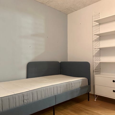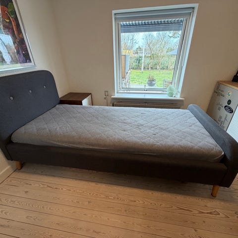 IKEA Blåkullen enkeltseng med sengegavl i blå stofpolstring. Sengen har lamelbund i træ og metalben. Gavlen går langs den ene langside og ved hovedenden, hvilket giver støtte, når man sidder op. Velegnet som enkeltseng i soveværelse, gæsteværelse eller børneværelse. Madrassen medfølger som udgangspunkt ikke, men kan aftales hvis interesse.