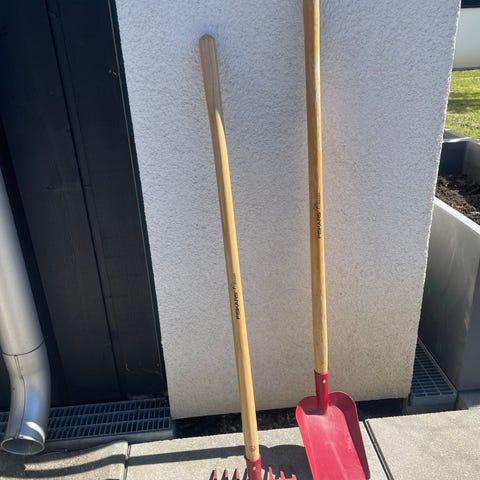 legetøjshaveredskaber i træ med blå plastdele. Sættet består af børneredskaber, der ligner rigtige haveredskaber i mindre størrelse, egnet til leg i haven eller sandkassen. Skaftet er i træ, mens hovederne er i blå plast. Velegnet til børn, der vil efterligne havearbejde på en sikker måde.