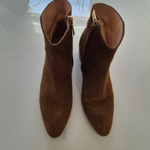 Støvler ankelstøvler i str. 38 i brun ruskind. Modellen er en kort ankelstøvle med elastikpaneler i siderne for nem af- og påtagning. Skoene har en lav hæl og gummisål med mønster for bedre fodfæste. Velegnet til hverdagsbrug i overgangssæsoner.