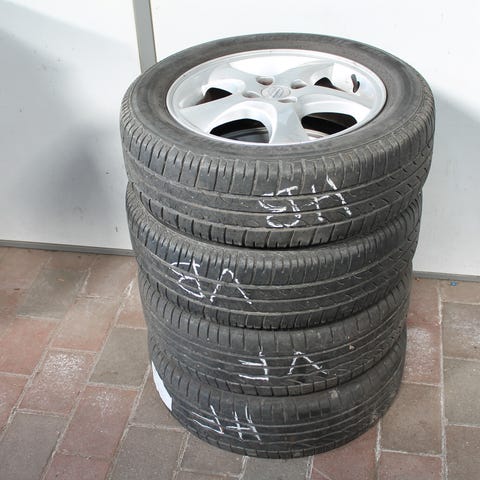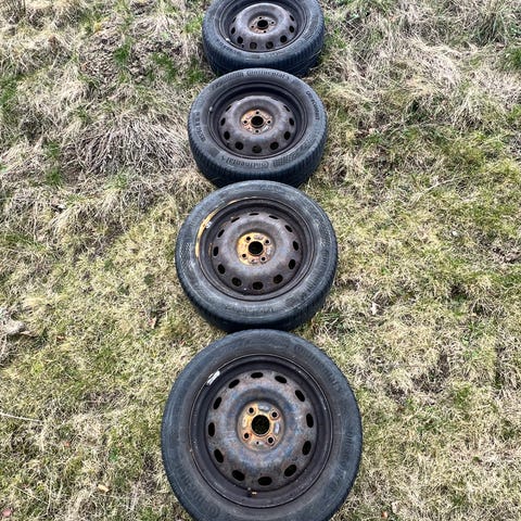 4 stålfælge med gl slidte dæk. Der er en visuel forskel på et par af dem, men de har samme mål. Ved ikke hvad de har siddet på.