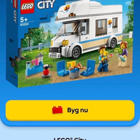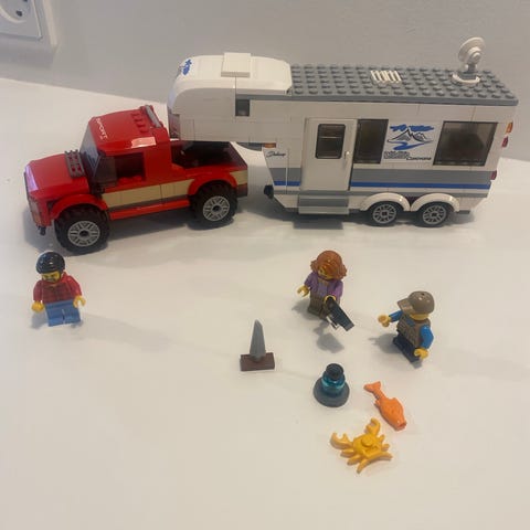 LEGO City legesæt med bil, campingvogn og tankstation. Sættet indeholder en blå bil, en campingvogn med tagbagage og surfbrætter, en lille bygning med betalings- eller servicestation samt flere minifigurer. Der er forskellige tilbehørsdele som computer, avis, kaffekop og mindre detaljer til at opbygge hverdagsscener i en LEGO City by. Velegnet til leg med køretøjer, rejse- og feriescener samt bymiljø.