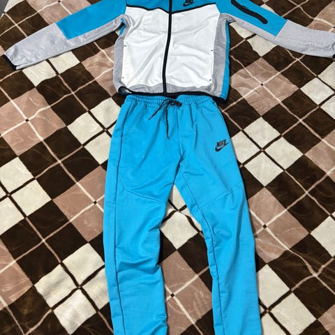Sættet er gråt med sorte detaljer og lynlåse. Hættetrøjen har gennemgående lynlås, hætte og sidelommer samt en lynlåslomme på ærmet. Bukserne har elastisk talje med snøre og lynlåslommer i siderne.