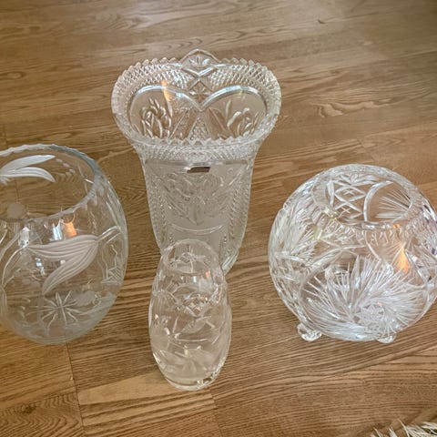 Sæt med to krystalvaser i klar facetslebet krystal. Den ene vase er høj og slank med rund fod og indgraveret mønster = 20,5 cm, velegnet til enkelte blomster eller små buketter. Den anden vase er lavere H=13,0 cm med facetteret, geometrisk mønster og bred åbning, egnet til mindre buketter eller dekoration.
