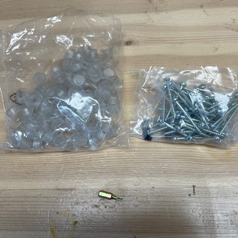 Sortimentskasse med skruer, møtrikker og skiver i plastkasse med bærehåndtag. Kassen er inddelt i flere rum med forskellige typer og størrelser af befæstelse, herunder skruer, møtrikker, skiver og små beslag. Se billederne. Låget er gennemsigtigt, så indholdet er synligt, og kassen lukkes med plastlåse. Der mangler måske et par stykker da kassen er åbnet, men indholdet fremstår ellers som nyt som man kan se på billederne.