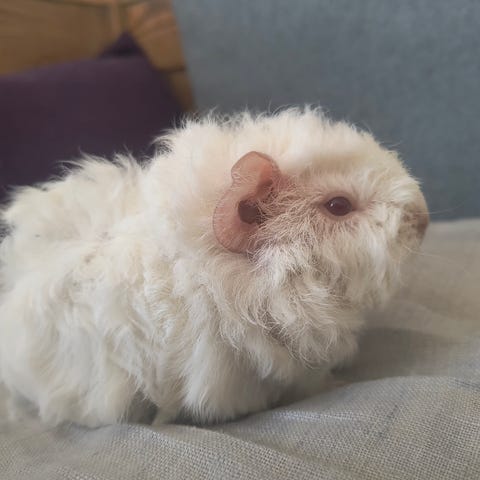 Lunkaya blanding, hvid hanunge sælges. Han er fra d. 21 marts og klar til ny familie når han vejer 300 gram og er 4 uger. Han har dejlig, blød, krøllet pels og som ejer må du være indstillet på lidt pelspleje. Far er raceren lunkaya med stamtavle, mor er hvirvlet sølvagouti. Marsvin er sociale dyr, så han sælges til dig der har en han i forvejen eller som evt. ønsker at købe begge brødre, der kan gå sammen ( se anden annonce).