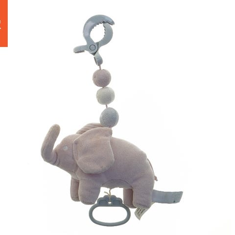Dette er et rød legetøj med lys og lyd funktioner. På toppen er der en figureret elefant med en blå hat og sløjfe. Legetøjet har flere farvede ledninger med små kugler, sandsynligvis til interaktive formål. Det er cirka 20 cm højt og har en knap på håndtaget til betjening. Bagsiden har et klistermærke med navnet 'Albert'.