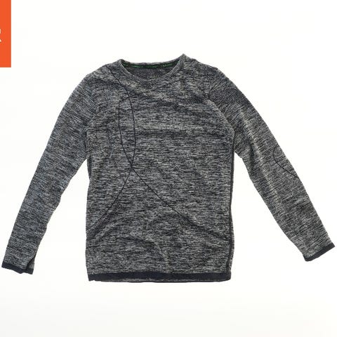 En langærmet trøje med sorte og blå horisontale striber og en høj hals.
