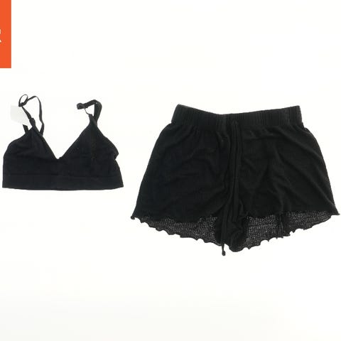 Sæt bestående af en top og shorts i grøn farve. Toppen har tynde stropper og en V-udskæring, mens shortsene har en elastisk talje med snøre.
