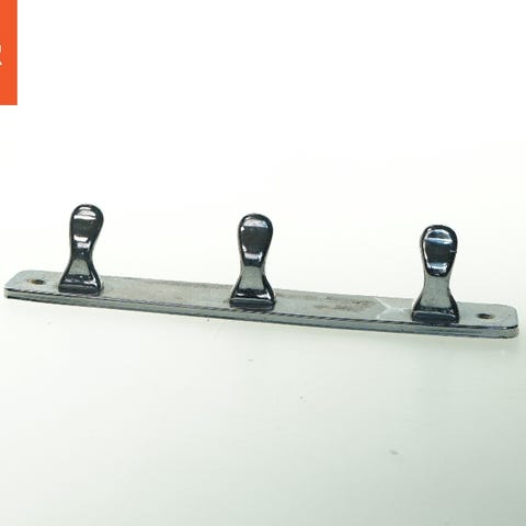 Knagerække med tre kroge, designet til vægmontering. Lavet af metal med en grå finish og gule knopper på krogene. Velegnet til brug i garderober eller entréer til ophængning af jakker, tasker, eller andre genstande. Monteringshuller er inkluderet for nem installation. Størrelsen på knagerækken er 30x11 cm.