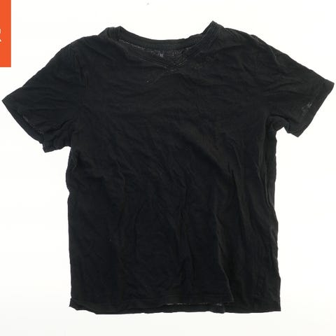 En kortærmet sort t-shirt med rund halsudskæring. T-shirten har et enkelt design uden synlige mønstre eller logoer.
