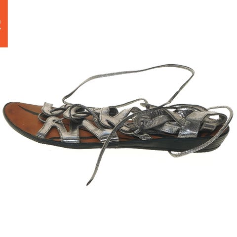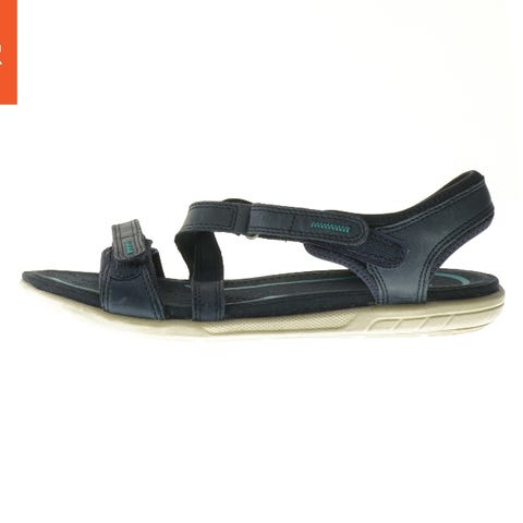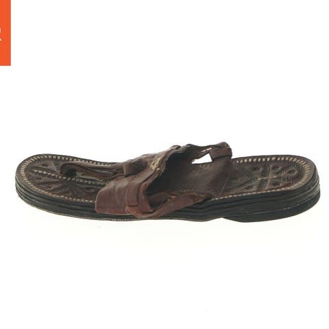 Et par sandaler i størrelse 39 med justerbare remme. Sandalerne har en brun farve med lyse og mørke stropper og en korksål. Designet er praktisk til både indendørs og udendørs brug.