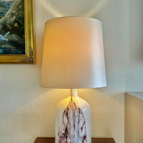 Mundblæst bordlampe i opalglas med den grå-blå marmorering, der løber langs lampens hals, og som kendetegner Blues-serien. Lampen findes i tre størrelser på henholdsvis 13, 19 og 26 cm. Dette er den store model. Lampen er designet af Sidse Werner og produceret i 1986. Den har været opbevaret i et skab og er aldrig brugt. Lampen har ingen ridser, slag eller revner, og er i særdeles god stand. Sælges uden Le Klint skærmen. Jeg vil gerne sende den rigtig solidt og godt indpakket, men da det er glas, bliver på dit ansvar.