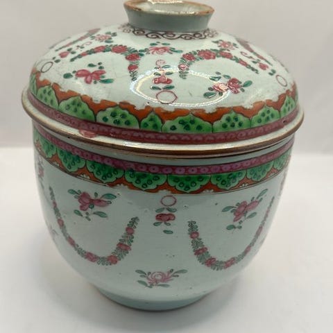 Disse to kinesiske kar fra anden halvdel af det 19. århundrede har en buet struktur i hvid porcelæn, prydet med livlige dekorationer i Famille Verte-stilen. Scenerne skildrer menneskelige figurer og børn i narrative og huslige sammenhænge, typiske for Qing-traditionen inden for kunst. Lågerne, toppet af små dyrefigurer som knopper, fuldender den klassiske æstetik af disse apoteks- eller dekorationsvaser.