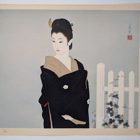 Iwao Akiyama træsnit, begrænset udgave 10/200 fra 1988, håndsigneret, 46 cm høj og 30 cm bred, Japan. Klik på den blå "gå til varen" knap, for at købe eller byde på denne vare. Den samlede pris vil blive vist inden du afgiver dit bud.