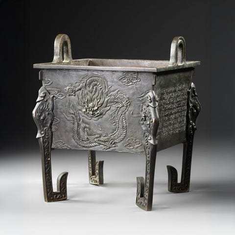Et fint udformet polykromt porcelæns røgelsesurne (censer) der skildrer en siddende Daoist Li Tieguai. Figuren fremstår i en afslappet positur oven på en falsk klippe- eller stenlignende base og holder en traditionel rygepibe. Ved siden af står en stor dobbelt-gourd-vasen (hulu), et klassisk symbol på lang levetid og helbred i kinesisk kultur.