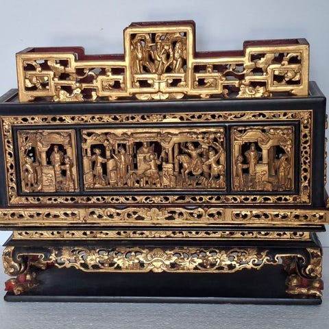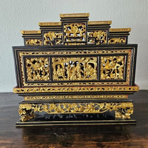 Et kinesisk udskåret træaltarstativ med pæon-dekoration fra den sene Qing-dynasti (ca. 1870–1900), i god stand, måler 26 × 20 × 10 cm, oprindelse Kina. Klik på den blå "gå til varen" knap, for at købe eller byde på denne vare. Den samlede pris vil blive vist inden du afgiver dit bud.