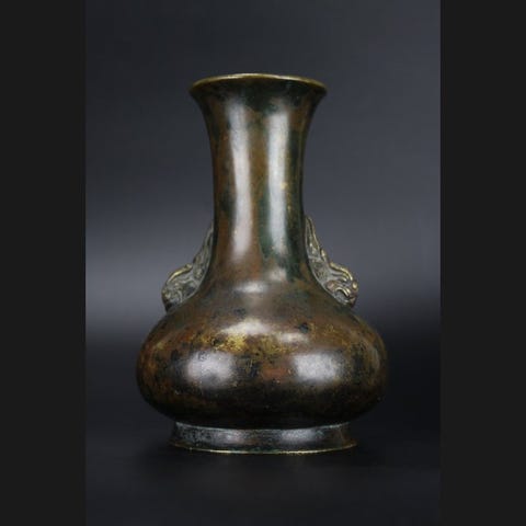 Bronzefigur af Guanyin med papegøje og vase fra sen-Qing-dynastiet (1850–1910), Kina, hultstøbt bronze, 23 cm høj, 11,5 cm bred, 9,5 cm dyb, vægt 2,22 kg, med spor af rød lak og guldring, ikke underskrevet, provenance: auktionshus, i god stand. Klik på den blå "gå til varen" knap, for at købe eller byde på denne vare. Den samlede pris vil blive vist inden du afgiver dit bud.