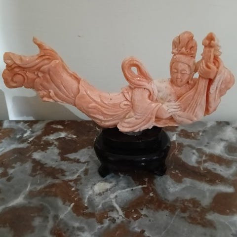 Stenen ledsages af en tilpasset træfod af nyere dato. Med en gammel etikette på undersiden af træfoden, ‘Dreng på delfin, omkring 1670 Kang Hsi, 36 […]’.