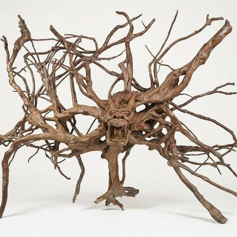 Drengen, der griber dragenes horn med den ene hånd og griber sit bølgende tørklæde med den anden. Dragefisken med store bulende øjne, veludskårne skæl, skarpe tænder og vinger. Stenen har en gennemskinnelighed i en fin celadon-tone med rustfarvede åretegninger og områder af mørkebrun.