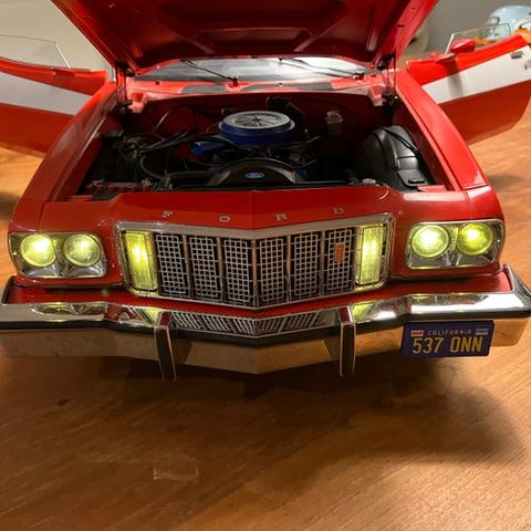Særdeles flot 1:8-skala af Ford GT40, der vil glæde samlere og Ford-entusiaster. Denne model måler 55 cm og vejer næsten 6 kg, fordi den er lavet af metal. Tro mod originalen i alle detaljer kan du tænde frontlygterne og beundre motorens detaljer.