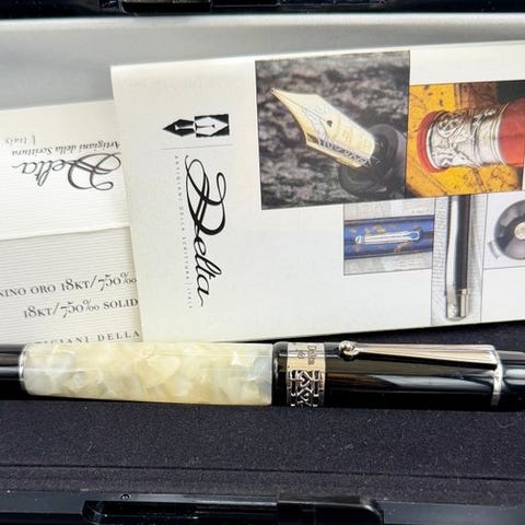 Pelikan Souverän fyldepen, model M300, i celleuloid og præmie resin med 18 kt forgyldede indlæg, standardnib i 14 kt guld (585), lavet i Tyskland, i fremragende stand, sjældent brugt og aldrig inket, med æske, længde 11 cm og diameter 1 cm. Klik på den blå "gå til varen" knap, for at købe eller byde på denne vare. Den samlede pris vil blive vist inden du afgiver dit bud.