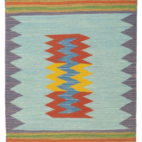 Denne håndvævede designerkilim imponerer gennem sit harmoniske, traditionelt inspirerede design og sin livlige farvepalet. Det centrale rombemønster danner midten af tæppet og omkranses af symmetriske, pileformede mønstre på begge sider.