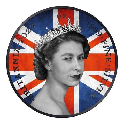 2023 1 oz £2 GBP sølvmønt fra Det Forenede Kongerige med Det kongelige våben og baggrund med Det britiske flag, 24k forgyldt farve på 0,999 rent sølv, oplag 100, diameter 38,61 mm, certificer og gaveæske. Klik på den blå "gå til varen" knap, for at købe eller byde på denne vare. Den samlede pris vil blive vist inden du afgiver dit bud.