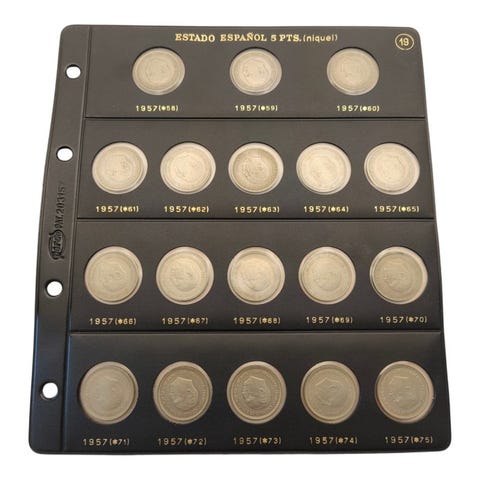 Blad med 15 mønter af 25 pesetas Franco, alle årgange, nikkelfinish, fra 1957 stjerne 58 til stjerne 75, alle med synlige stjerner, bevaringsstatus uden certifikat, nogle i Proof-tilstand. Klik på den blå "gå til varen" knap, for at købe eller byde på denne vare. Den samlede pris vil blive vist inden du afgiver dit bud.
