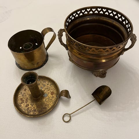 Blandet lot. messing . , Messing, Blandet lot messing. Vejer 8- 10 kg. .. 3 lysestager 200kr. 1 vase 100kr. 1 morter m støder 300kr. 1 tønde” 150kr. væglampe m 3 skærme250kr. og dørhammer 200kr. Sælges helst samlet. For 900kr