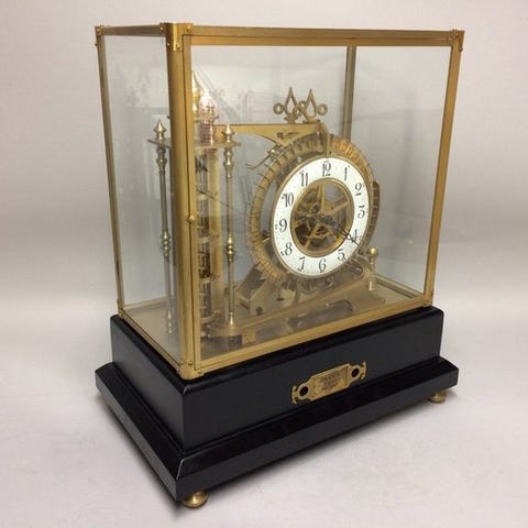 Art Deco sølvbelagt skeletur med mekanisk bevægelse, anslået periode 2025, fremstillet i Kina, ubrugt og i funktion, højdemål 40 cm, bredde 27,5 cm, dybde 26,5 cm, vægt 8,5 kg. Klik på den blå "gå til varen" knap, for at købe eller byde på denne vare. Den samlede pris vil blive vist inden du afgiver dit bud.