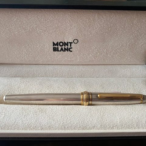 Montblanc Meisterstück Olympic Heritage Chamonix 1924 – Solitaire LeGrand fountain pen med sølvbelagt krop og platinbelagte lås og clip, 18K guldfers størrelse F, længde 14,7 cm, diameter 1,4 cm, oprindelse Tyskland, produceret 2010–2020, i ny stand og ikke brugt, inkluderer originalboks og serviceguide. Klik på den blå "gå til varen" knap, for at købe eller byde på denne vare. Den samlede pris vil blive vist inden du afgiver dit bud.