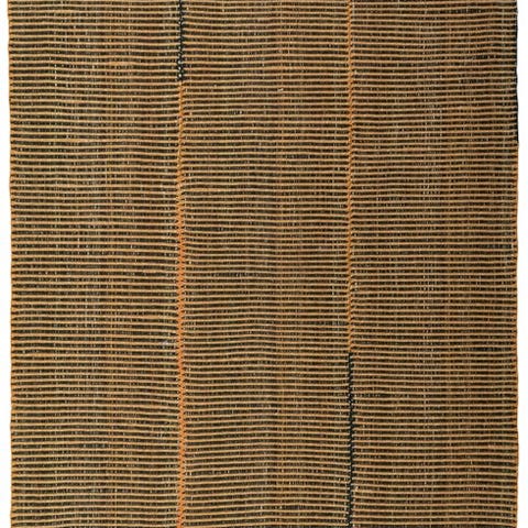 Denne storformat håndvævede designer kilim imponerer med sin kraftfulde, grafiske komposition og en afbalanceret farvedramaturgi. I midten står en markant vertikal blok i dyb rød, omgivet af sorte og grå nuancer, der blødt falder ind i den lyse, naturfarvede bund. De smalle kantborde i varm rød øverst og nederst giver designet en rolig, lukket ramme.