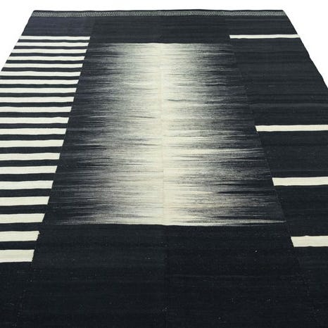 Den reducerede farvepalet og det klare, symmetriske motiv giver kilim’en en moderne, næsten arkitektonisk effekt, der især kommer til sin ret i rummelige opholdsrum, Lofts eller repræsentative områder. På trods af sine klare linjer bevarer tæppet den håndværksmæssige varme gennem den fine