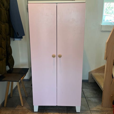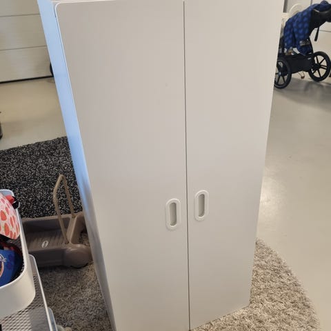 IKEA klædeskab til børn i blå og hvid. Skabet har to låger, en hylde øverst, bøjlestang samt 4 trådkurve.