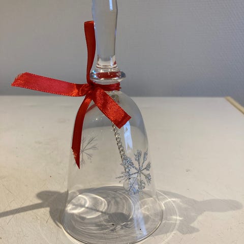 Glasklokke jul, Juleklokke i glas. Fin til pakkespil eller “nissevennegave”. Se mine øvrige opslag, der er flere egnede ting til de formål.