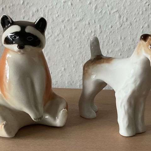 Smukke tiger porcelæn figurer af en liggende tiger mor og en tigerunge. Figurerne er håndmalede i orange, sort og hvid. På begge figurer under ses mærkning med "Made in USSR". Det er russisk porcelæn og svare til vores kongelige danske porcelæn. De har ingen skader og sælges kun samlet.